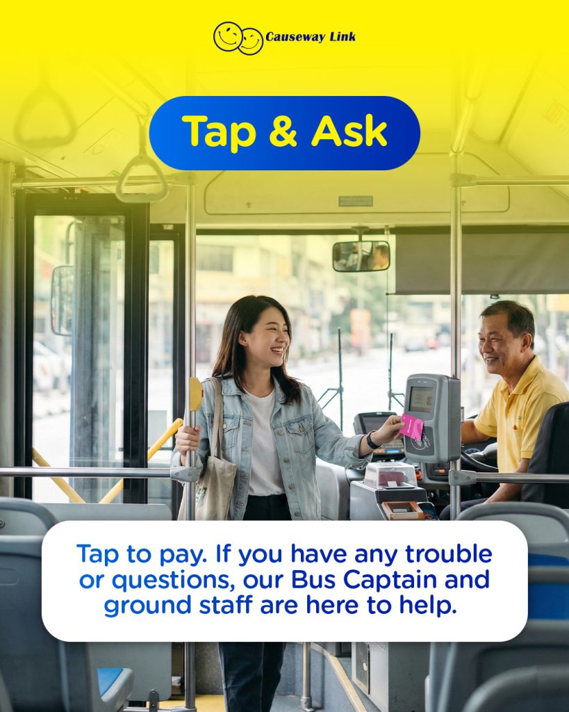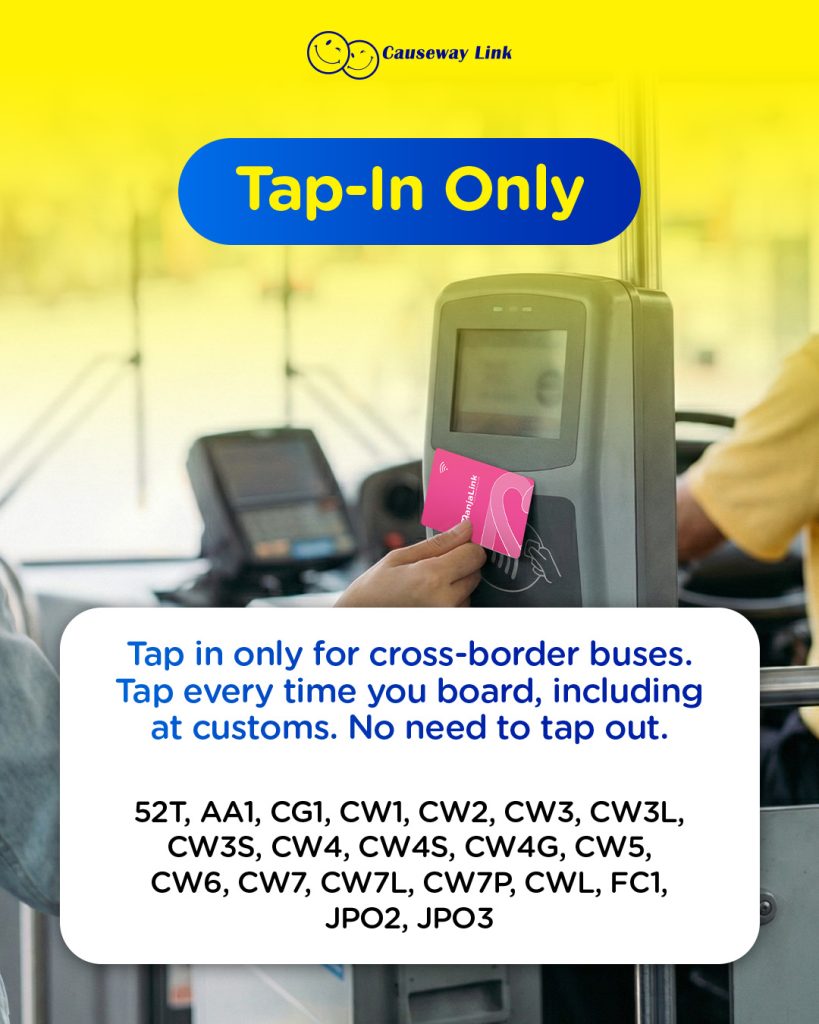 For cross-border routes, you only need to tap in when boarding as the tap-out step is not required. Remember to tap again each time you re-board the bus after clearing customs.