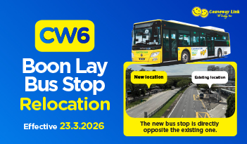 We would like to inform all commuters that the CW6 Boon Lay Bus Stop will be relocated starting 23 March 2026. This change is made to improve commuter convenience and traffic flow around the area.